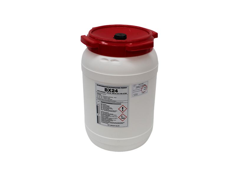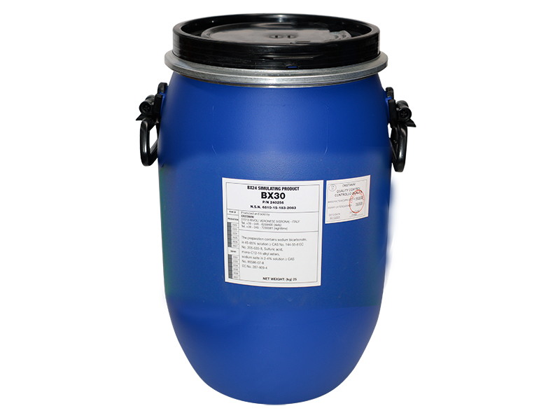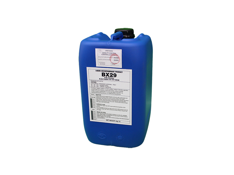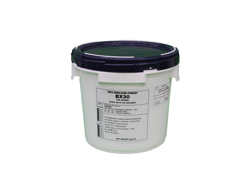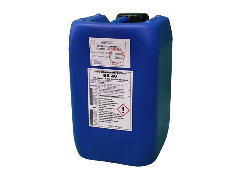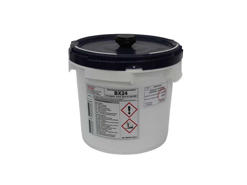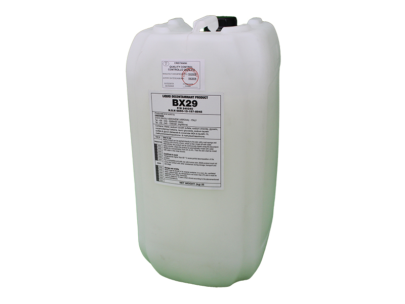 BX24 es un agente de descontaminación y desintoxicación polivalente y de amplio espectro, diseñado para uso operativo en materiales, vehículos, infraestructuras y terrenos. Sirve de apoyo a las operaciones militares y de defensa civil, incluidas las actividades de descontaminación durante el redespliegue desde teatros de operaciones en los que pueda haber contaminación química, biológica y radiológica (QBRN).
