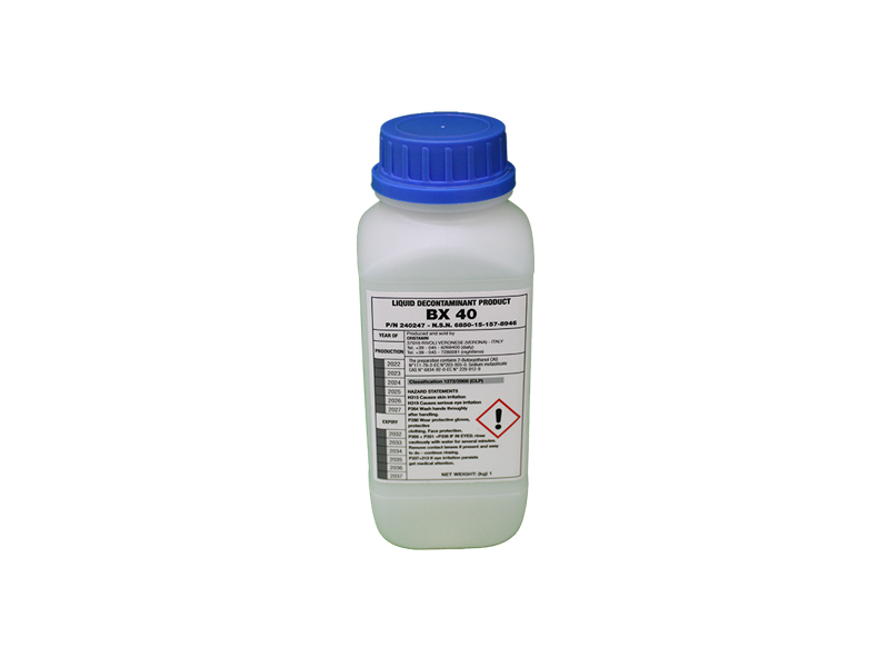 BX40 es un descontaminante líquido concentrado formulado para la descontaminación radiológica/nuclear (RN) de superficies externas, incluidos aviones, helicópteros